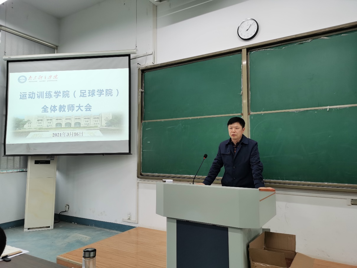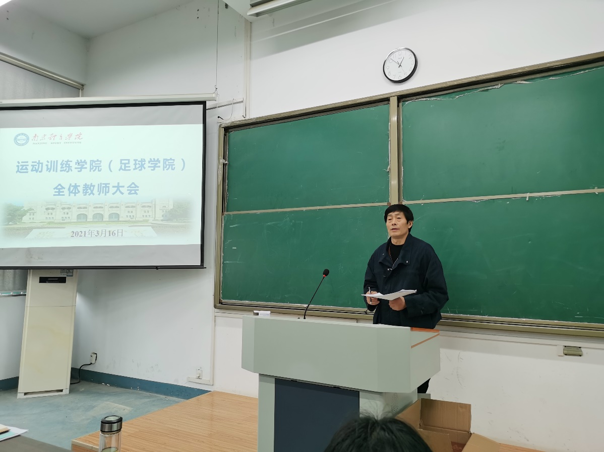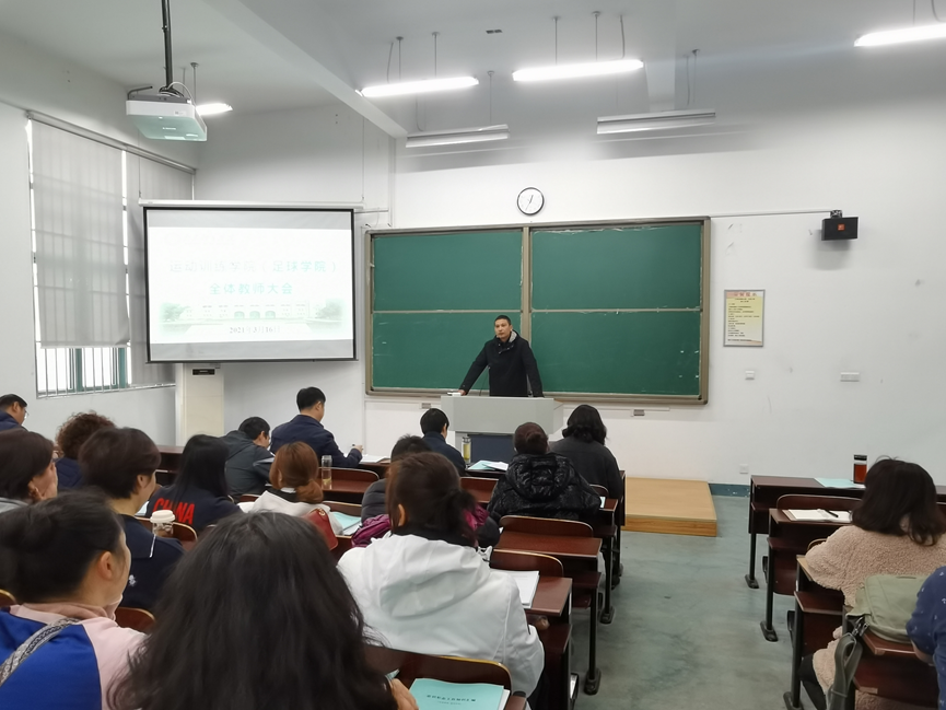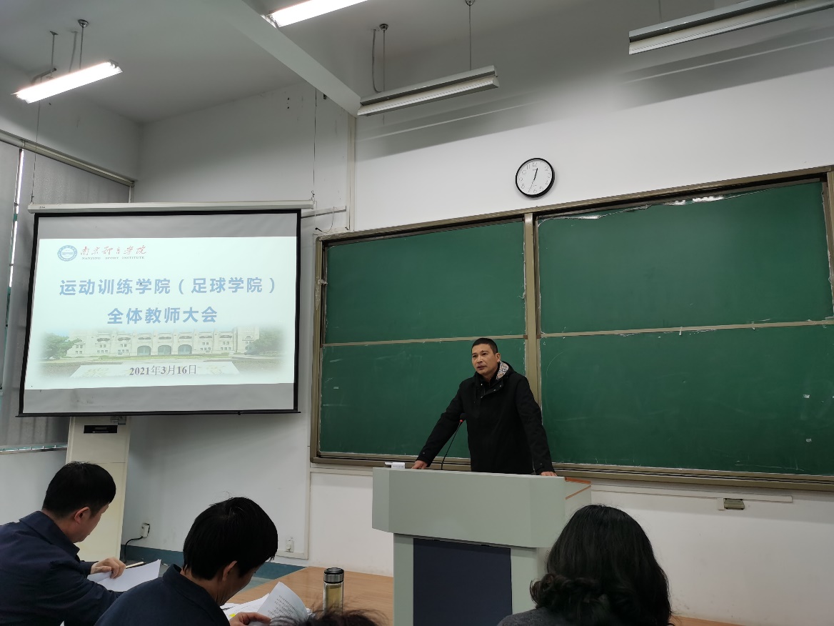 3月16日下午,运动训练学院在仙林校区218教室召开全体教师大会。会议对近期教学工作进行部署,对学院“十四五”规划、2021年学院目标任务书及2021年度经费下达情况进行解读。会议由副院长张明主持。
