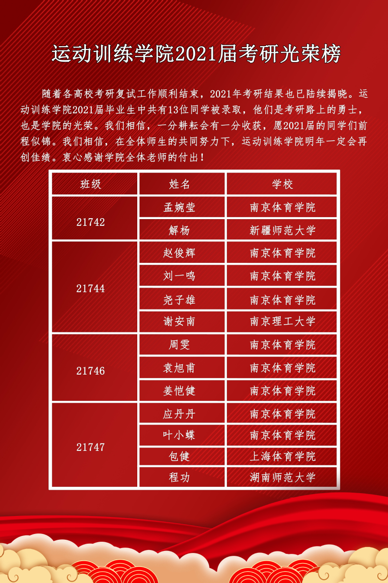 2021年运动训练学院2021届学生共有13名同学被国内高校录取,继续深造,希望同学们未来继续努力!