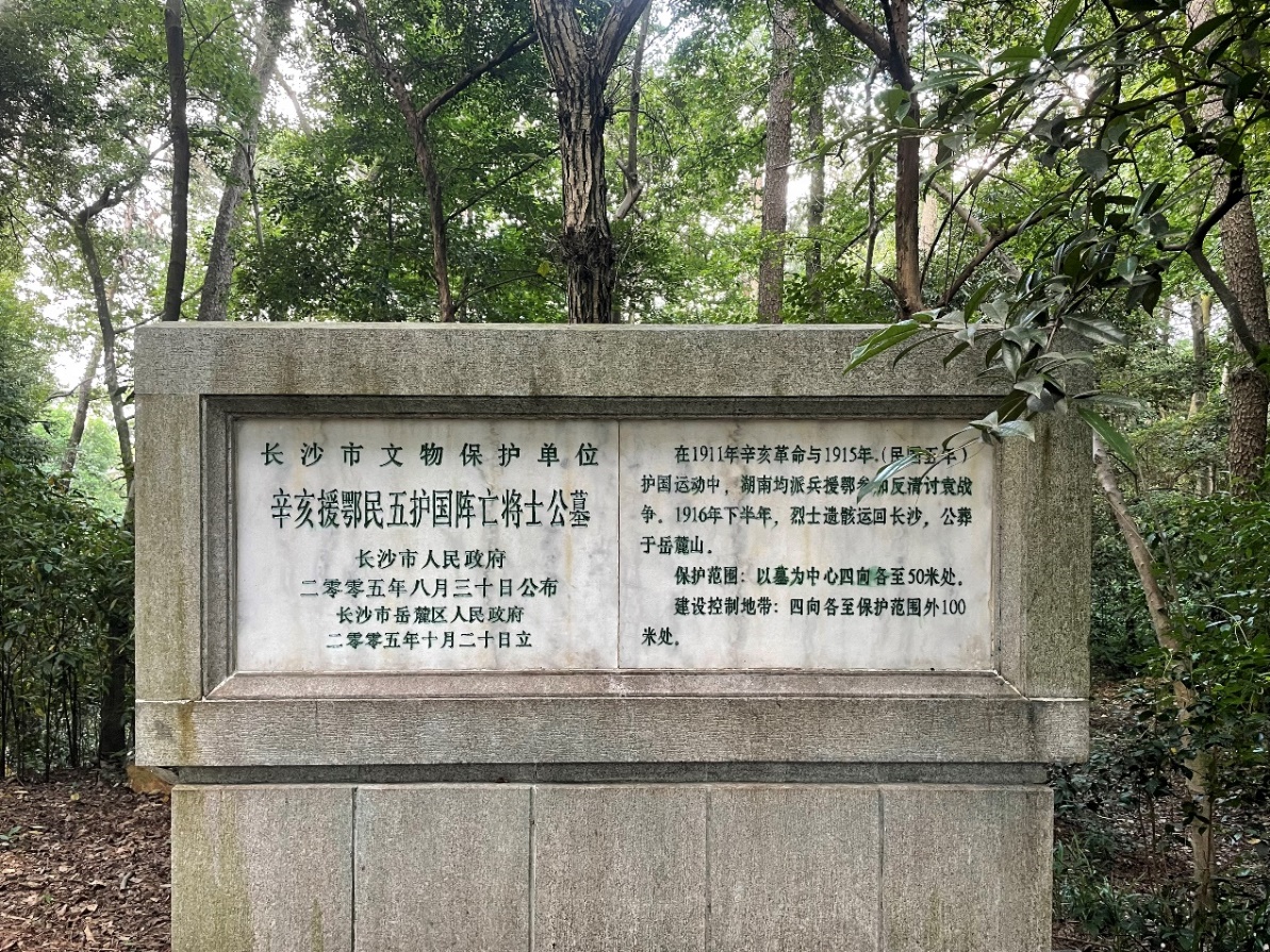 岳麓山五轮塔东侧的山坡下,有一处坐北朝南的简朴式烈士公墓,两排并列,基有十六家,冢前都立有石碑——“辛亥援鄂民五护国阵亡将士公墓”。冢前小石碑上刻有烈士的名字,还有两块是无名烈士。时间追溯到百年之前,他们是十六条好汉,他们是血气方刚的革命军人。为了巩固武昌起义的胜利成果,为了制止封建帝制死灰复燃,为了恢复共和挽救国家,他们扶危济困,血洒战争,魂归故里。他们是湖湘人民的骄傲,他们的功绩永垂史册。怀着沉重的心情,实践队员们纷纷于墓碑前停下,鞠躬致敬。