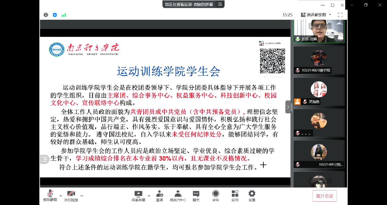 为进一步强化社团建设,提升2021级新同学对于校园文化的认识和参与的积极性,学院学生社团负责人刘宸老师为同学们详细介绍了运动训练学院学生会的部门机构设置、活动情况、评议激励及部门联动机制,并就学生会迎新招新选拔机制做了进一步讲解。
