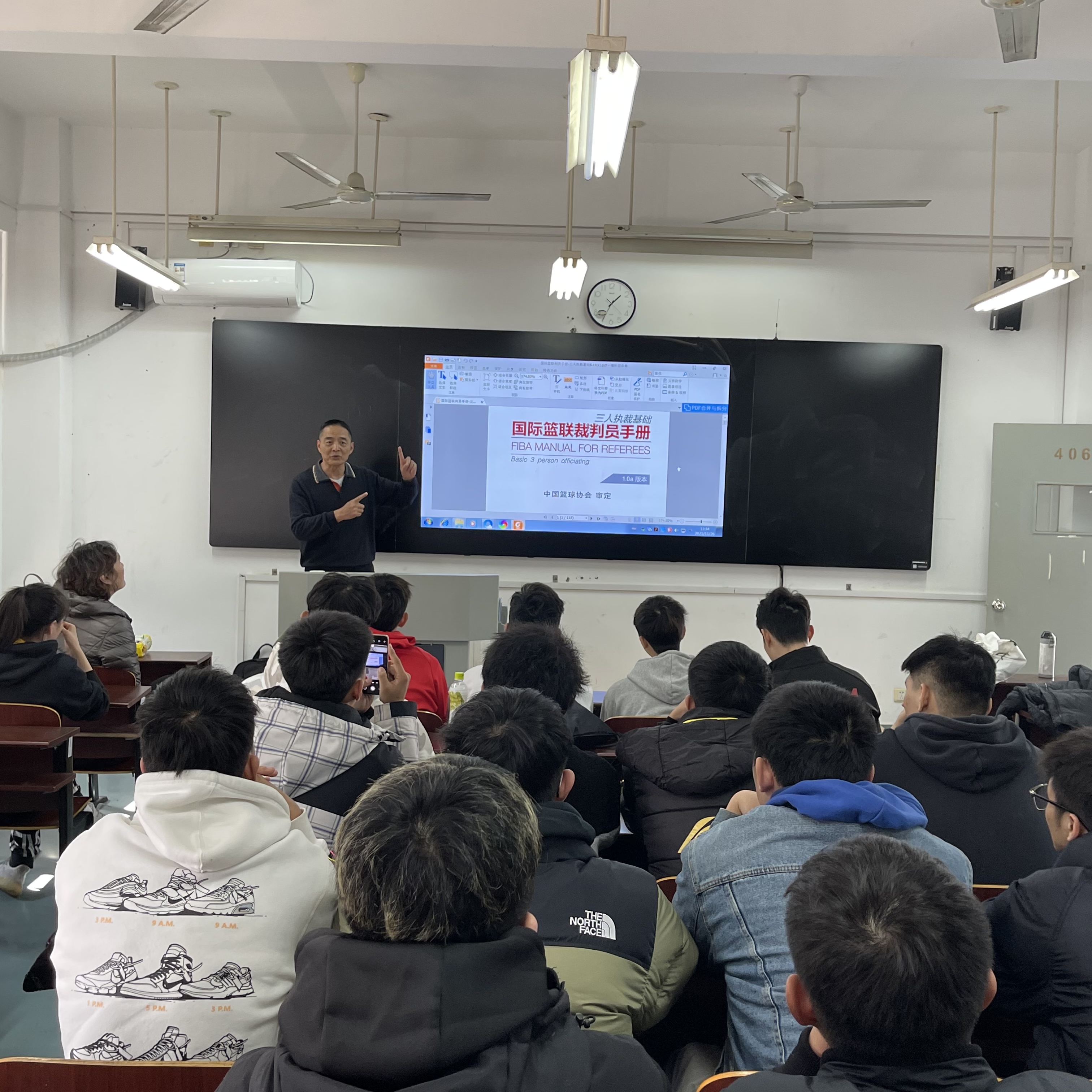 2021年11月26日,运动训练学院邀请篮球国际级裁判员、CBA技术代表孙卫兵给运动训练学院篮球专项学生专题讲解FIBA最新裁判法。运动训练学院篮球老师郑言霞、范海燕、徐为人等参与讲座。