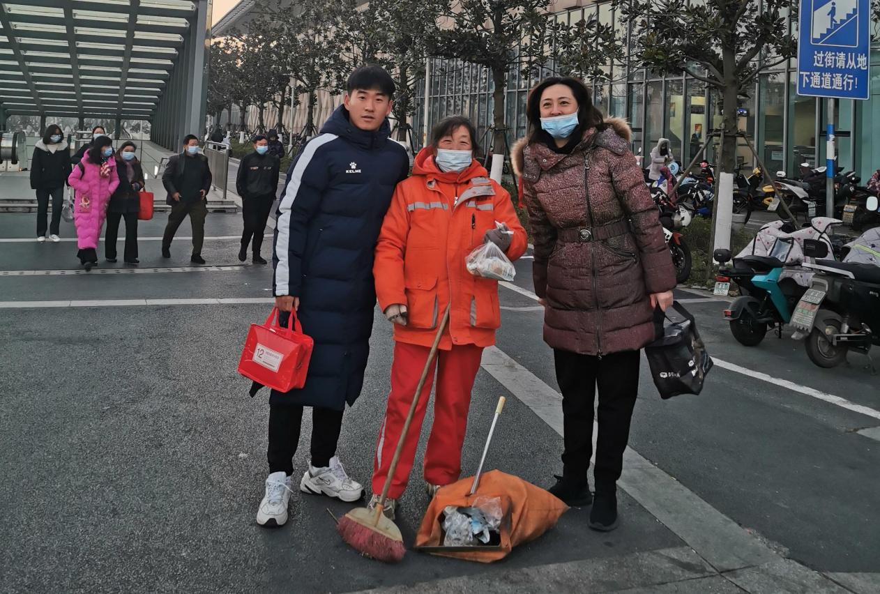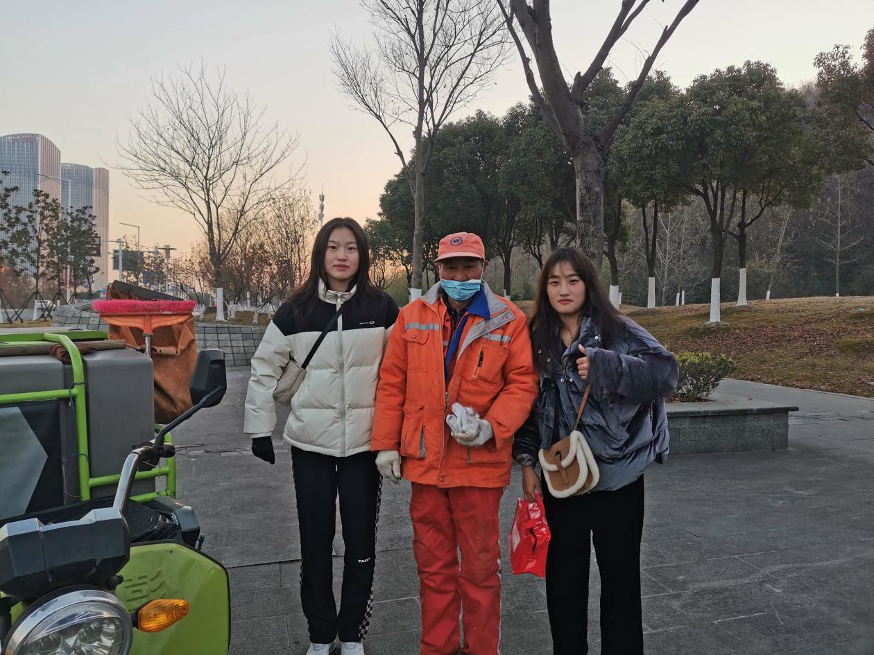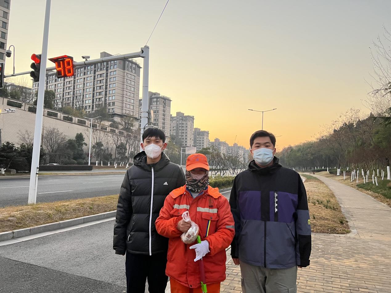 运动训练学院志愿者和南京大学的志愿者们兵分四路,热情高涨走上街头,将爱心早餐送到环卫叔叔阿姨手中。他们吃着热乎乎的早餐,开启新一天的工作,这个气温跌破冰点的清晨,也变得温暖起来。