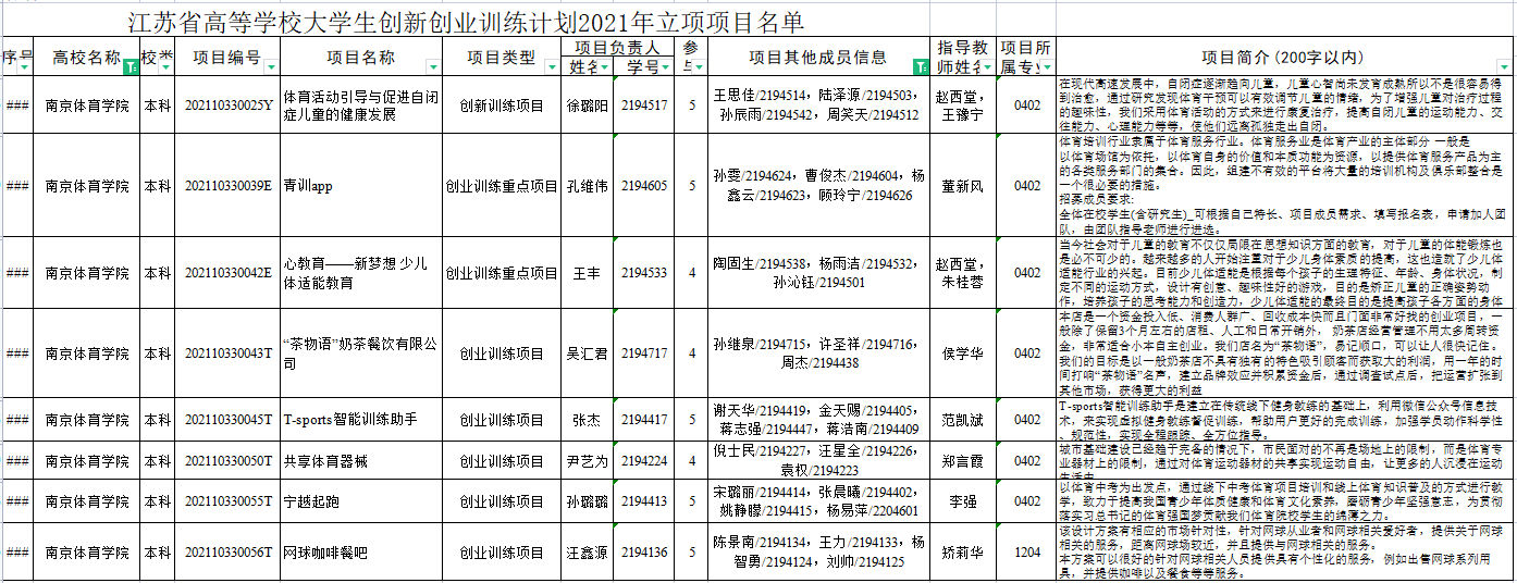 近日,省教育厅办公室印发了《省教育厅办公室关于公布2021年大学生创新创业训练计划立项项目的通知》(苏教办高函〔2021〕30号),经学校遴选推荐、省教育厅审核,我校共获批省级项目59项,其中运动训练学院8个项目获得2021年江苏省高校大学生创新创业训练计划项目立项,包括:创业训练重点项目2项、创业训练项目5项、创新训练项目1项。