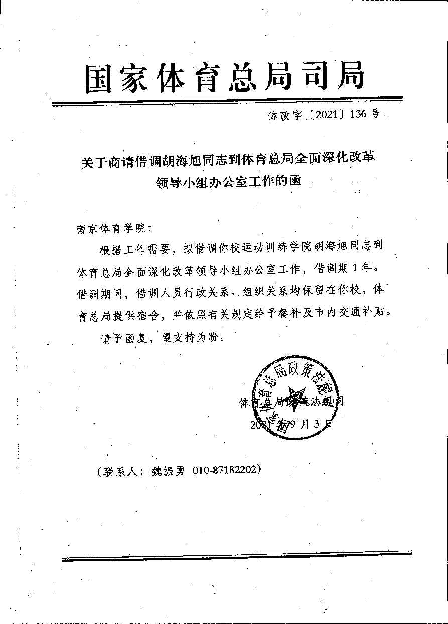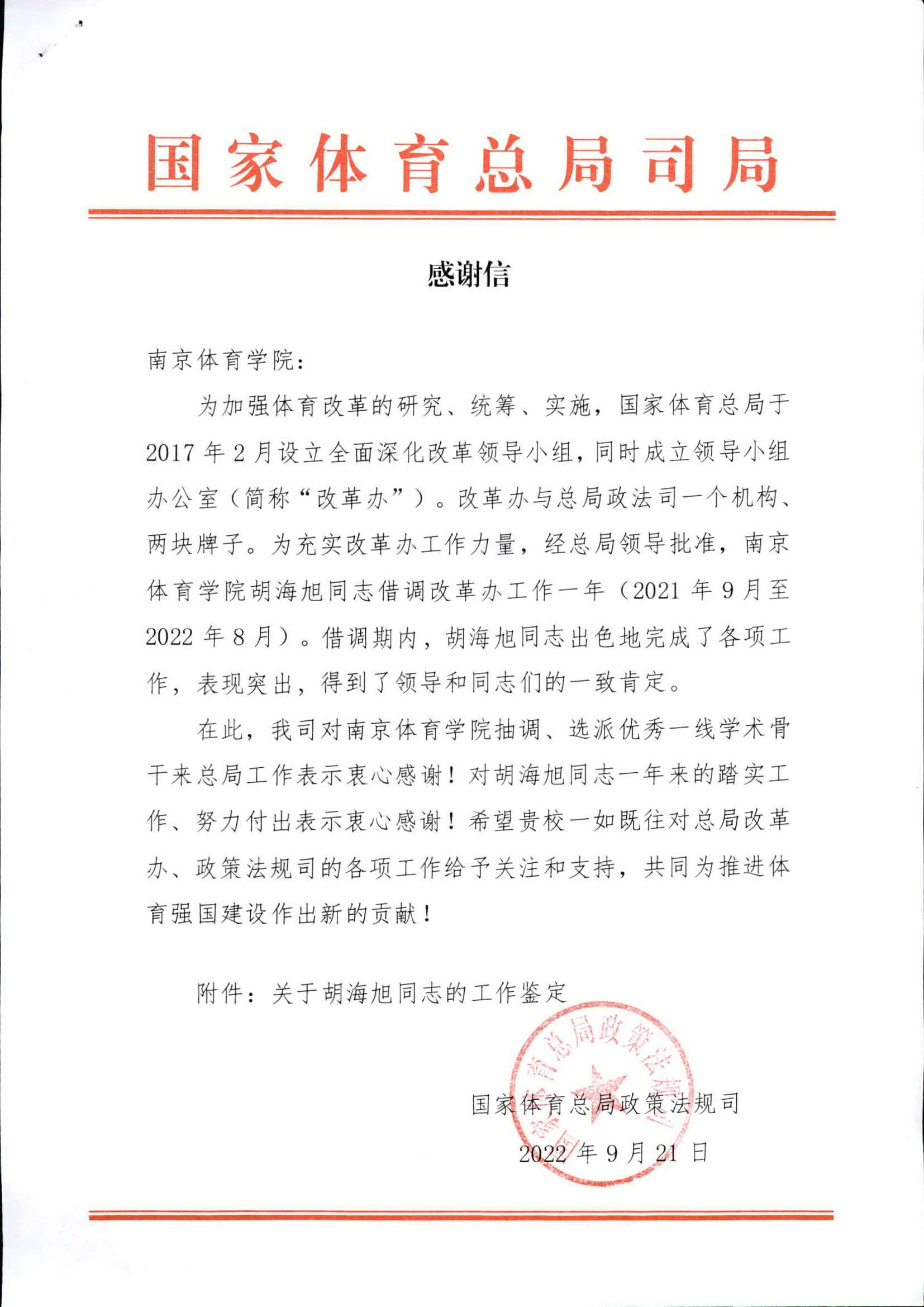 近日,国家体育总局政策法规司向我校发来感谢信,对我校运动训练学院副教授胡海旭博士在国家体育总局借调一年期间的出色表现给予充分肯定,并对我校选派学术骨干到总局工作表示感谢。