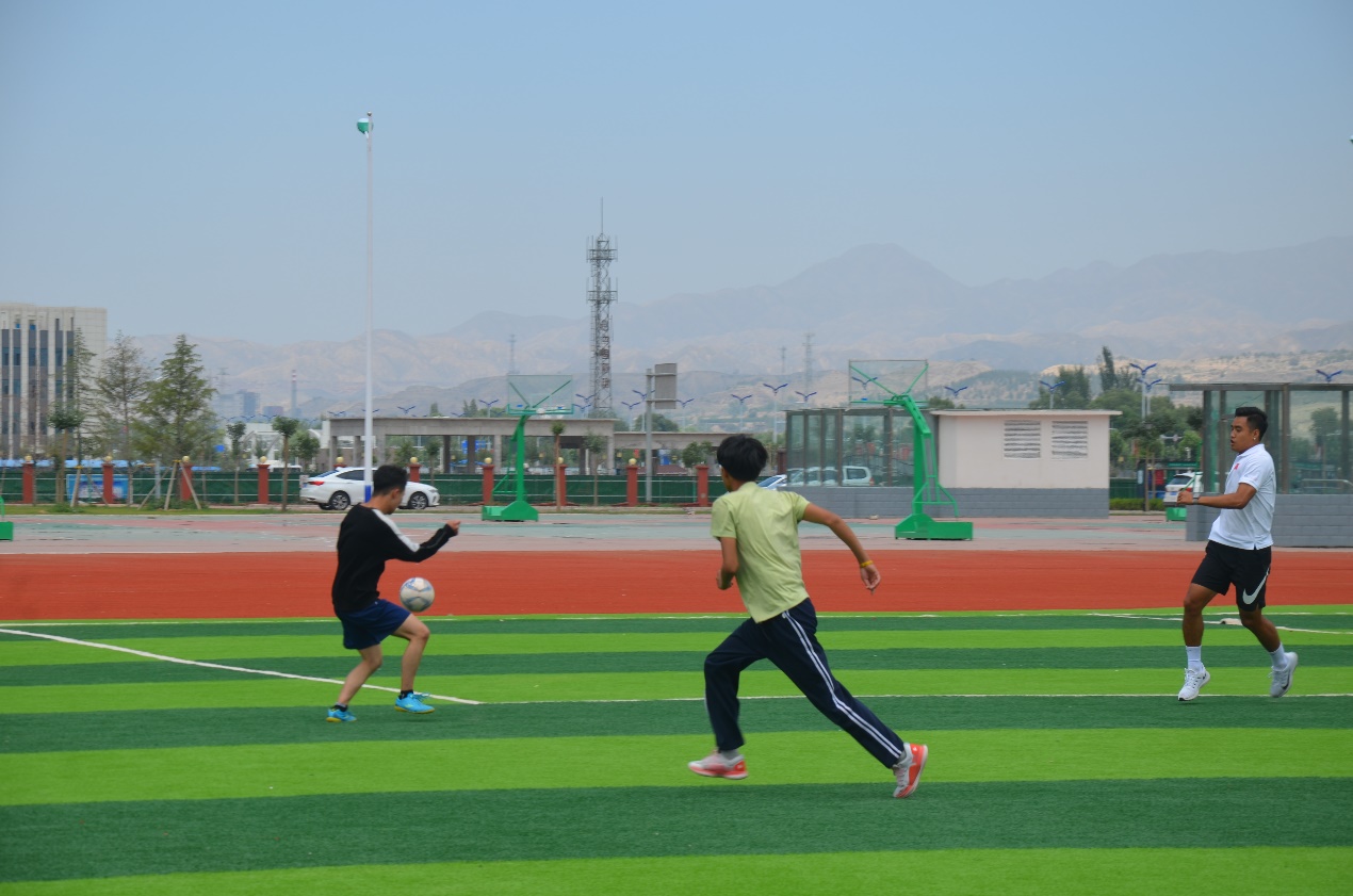 在宣讲内容结束后实践队伍成员回到操场上与东乡县石化中学足球队的球员们进行简单球技交流。