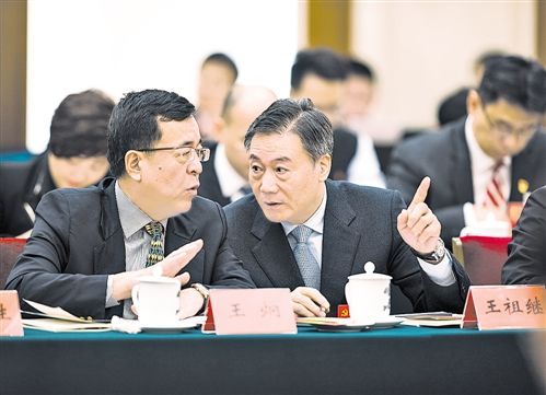 中央金融代表团举行会议,讨论习近平总书记向大会所做的报告。党的十九大代表王炯(左)和王祖继(右)就报告内容进行讨论。记者 李景录摄