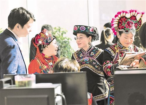 10月23日,云南省代表团会议结束后,党的十九大代表高招飘(左二、哈尼族)、马开慧(右二、水族)等热议民生话题。记者 高兴贵摄