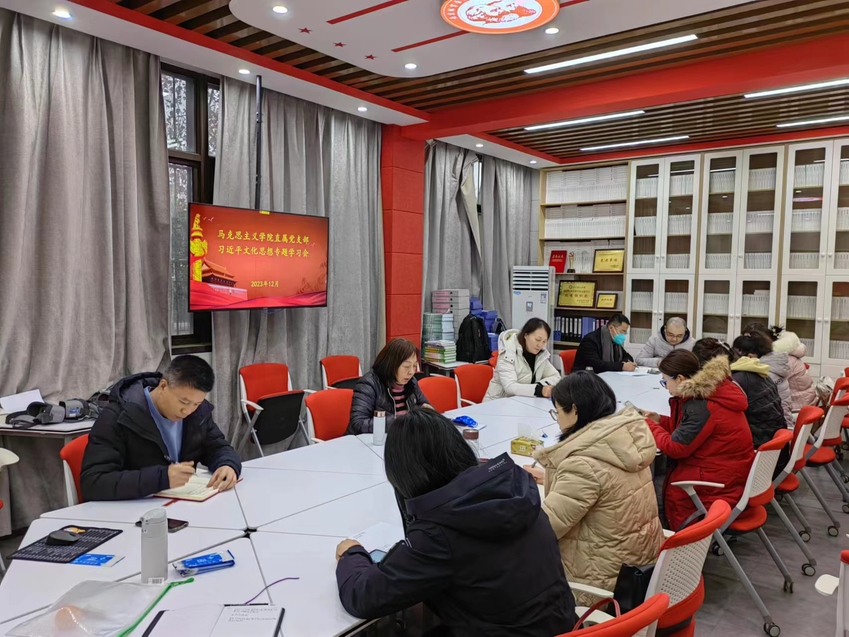 12月15日下午,马克思主义学院直属党支部在思政课教学实践中心召开习近平文化思想专题学习会。会议由马克思主义学院直属党支部书记葛翠柏主持,副书记石红霞和支部全体党员参加了会议。