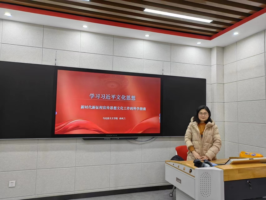 孙凤兰以《学习习近平文化思想——新时代新征程宣传思想文化工作的科学指南》为题为全体党员讲授专题党课。孙老师从“习近平文化思想提出的时代背景”“习近平文化思想的丰富内涵及理论特征”“习近平文化思想的战略意义”“深入学习宣传贯彻习近平文化思想”四个方面进行授课,娓娓道来,内容丰富,使支部党员对习近平文化思想有了全面透彻的理解和领悟。