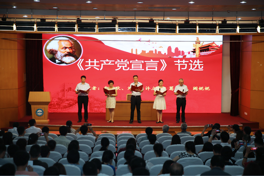 讲师团团长朱传耿带领讲师团成员刘健、许立俊、葛翠柏、阚妮妮诵读了《共产党宣言》(节选)。《共产党宣言》阐述了科学社会主义理论,揭示了人类社会发展的客观规律,是马克思主义诞生的标志,是中国共产党人的理论旗帜。170年来,《共产党宣言》一直深刻地启迪、教育和鼓舞着全世界一切为人类进步事业而斗争的人们,它的真理光辉照耀着全球的每一个角落。在马克思诞辰200周年之际,聆听讲师团带来的经典诵读,重温《共产党宣言》这一对人类社会发展产生着深远影响的宏篇巨著,与会人员依然能够感受到马克思的崇高精神和光辉思想,依然能够感受到真理无坚不摧的永恒力量。