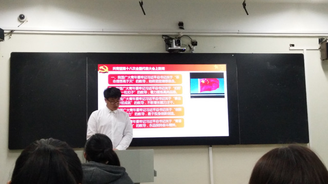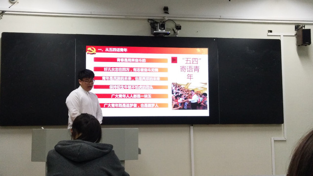 翁同学从“从五四话青年”、“习近平十九大寄语青年”、“共青团十八大对青年的要求”、“新时代新青年的要求”等五个方面展开论述。从五四话青年,在新时代的大背景下,要赋予五四精神新的内涵。与此同时,播放的《少年中国说》演讲视频,将课堂气氛活跃起来。