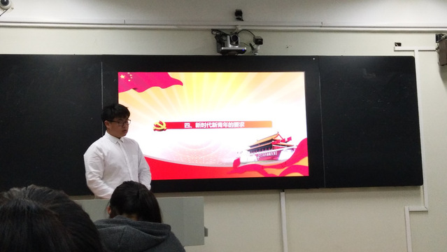 2018年10月中旬,我校新思想研习社社长翁凡棋同学以“新时代新青年”为题,为社团的社员们上了一堂别开生面的思政课。本次课程的主要目的是:学习习近平总书记十九大报告和共青团十八大的精神,让同学们认识到新时代赋予青年的重大责任和义务,意识到成为一名合格的社会主义接班人的必要性和紧迫性。