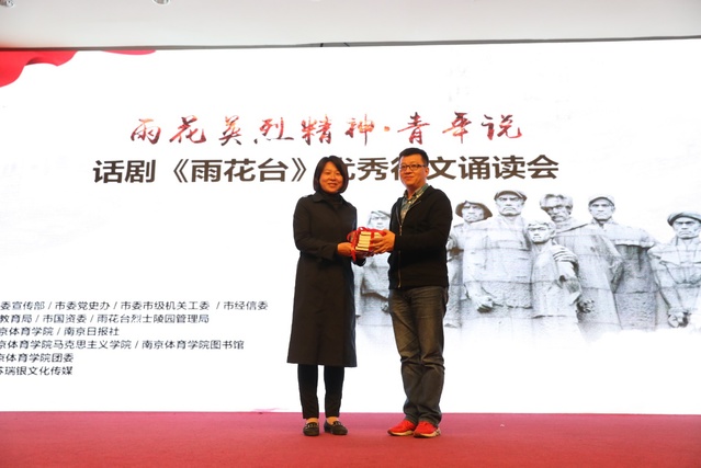 南京雨花台在中国近现代史上留下了一座血与肉铸成的精神丰碑。2016年至2017年,由中宣部、教育部主办,江苏省委宣传部、省教育厅、南京市委承办的话剧《雨花台》全国高校巡演活动,先后走进北京、上海、武汉、广州以及江苏各地高校上演了100场,运用文艺演出、英烈事迹展览结合线下活动宣传的手段,在高等院校内传播雨花英烈精神。巡演期间,由南京日报社和南京市雨花台烈士陵园管理局举办的“穿越时空的对话——信仰的力量”当代青年给雨花英烈回信征文活动引起了各地大学生的热烈反响,青年学子纷纷用文字记录下了自己受到的震撼和感动、对英烈的敬仰、对自我的期许、对时代的担当。现场由南京日报社编委李晓龙向我校图书馆赠送了100本优秀征文集。