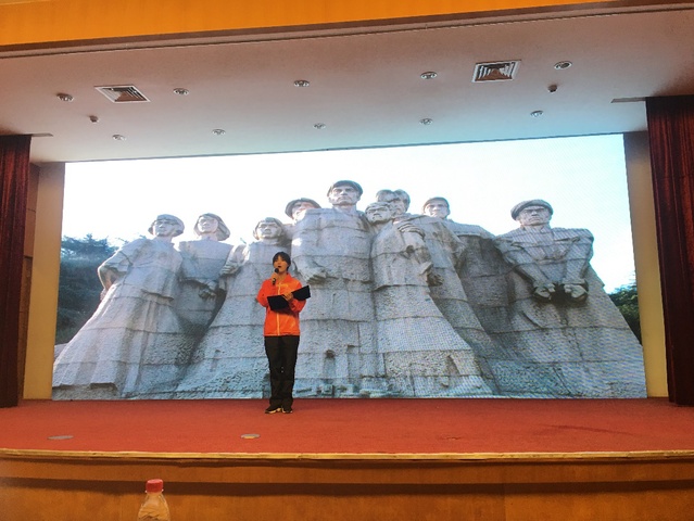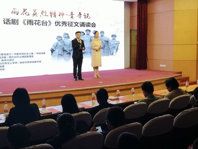 此次“话剧《雨花台》优秀征文诵读会”由南京市委宣传部等单位指导,南京日报社联合我校马克思主义学院、图文信息中心、团委共同承办。副校长李江、党委宣传部部长许立俊、人事处处长王成钢、教务处处长严海平、训练处处长张健、学工处处长唐存楼、资产处处长戈学宝、马克思主义学院副院长、宣传部副部长葛翠柏、图书馆副馆长葛见珠、团委书记王猛等领导观看了诵读会。承办单位全体员工、马院六联系单位资产处、离退休办、工会的员工代表以及近三百名大学生和运动员被现场诵读者的倾情诵读深深打动,反响热烈。