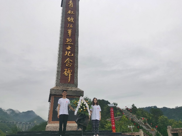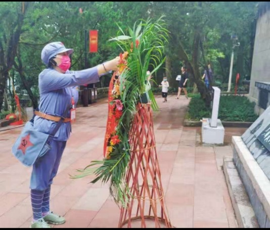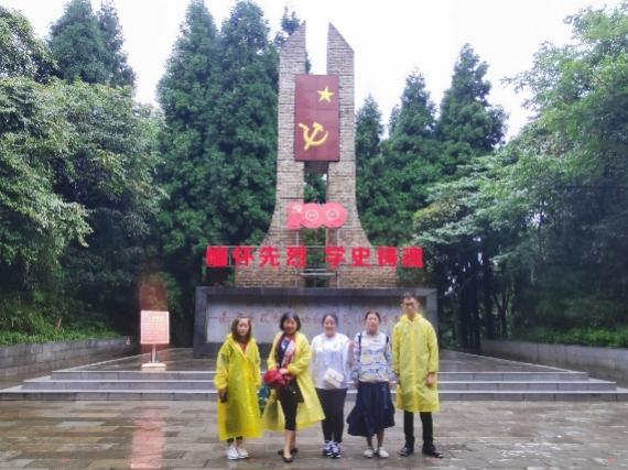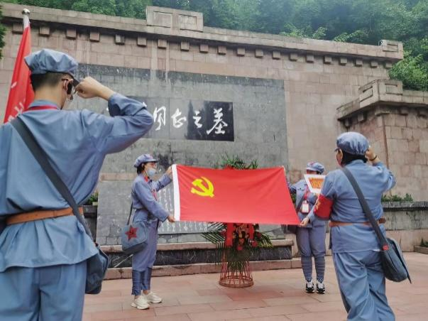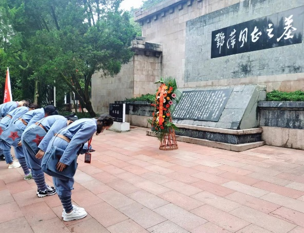 为继承红色基因、传承革命精神,团队成员走进坐落于遵义市凤凰山麓小龙山上的红军烈士陵园。在绵绵细雨中,走进陵园大门,沿317级青石阶而上,气势磅礴的“红军烈士纪念碑”映入眼帘,这座纪念碑是1984年为纪念遵义会议50周年而建造,正面是邓小平同志在那年11月2日题写的“红军烈士永垂不朽”八个大字。解放后,遵义人民在战场遗迹找到77位红军烈士坟墓,陆续将烈士遗骸迁至这里的陵园,纪念碑后方就是红三军团参谋长邓萍将军的陵墓,邓萍将军是红军长征中牺牲的唯一一位军团级将领。在敬献花篮后,葛翠柏走上前仔细郑重地整理挽联,全体成员鞠躬致敬并默哀以表缅怀之情,在场党员重温入党誓词。