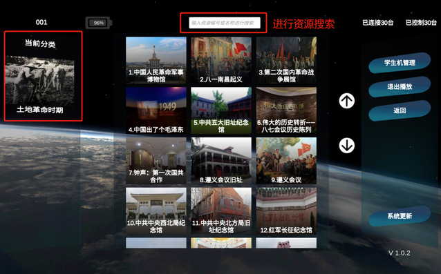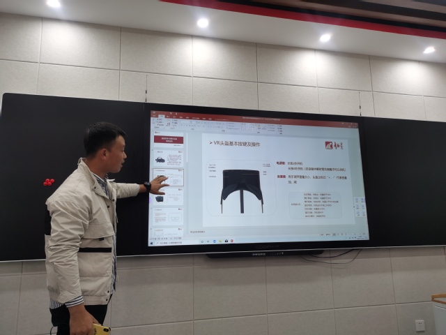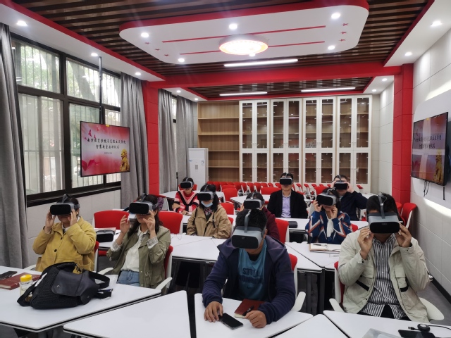 中心配备智慧黑板、液晶电视、可移动组合桌椅、思政资源发布系统一体机以及VR实践教学设备和电子资源。VR(Virtual Reality)即虚拟现实,主要指借助计算机系统及传感器技术生成一个三维环境,创造出一种崭新的人机交互状态,通过调动用户所有的感官,带来更加真实的、身临其境般的体验。中心配备的思政VR头盔还原场馆实景,体验仿真的场馆环境,在疫情特殊背景下,让学生“足不出户”学习红色故事、领会红色精神、传承红色基因。思政资源发布系统一体机的可移动式大屏,具备手机扫码借阅下载思政图书、视频等资源的功能,及时推送时事热点专题。