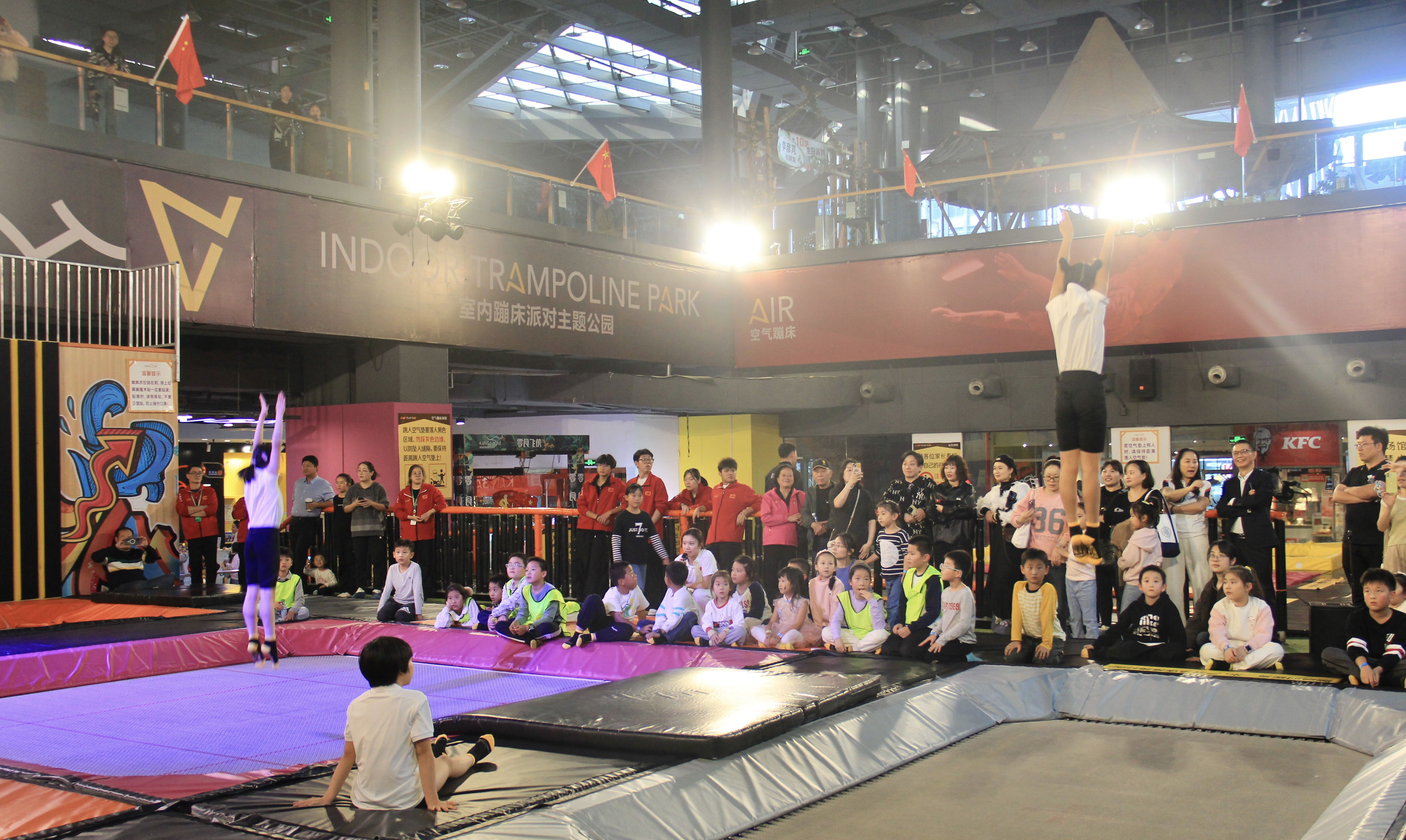 随后运动员们来到运动场地,和大家一起互动交流。小朋友欣赏着运动员的展示,交流探讨着蹦床的专业技能,在这里,他们全情投入,感受蹦床运动带给他们的快乐。