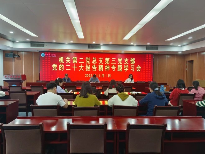 11月1日下午,机关第二党总支第三党支部在行政办公楼201会议室召开党的二十大报告精神专题学习会,计划财务处全体人员参加会议。支部书记王利雅主持会议并领学相关内容。