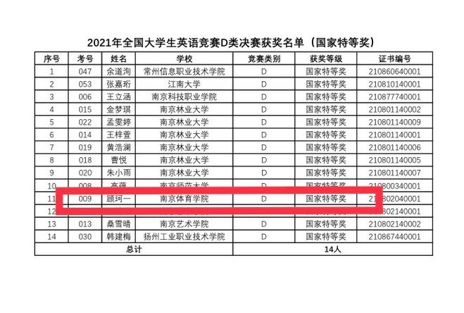 经过校内初赛选拔,我校选派初赛一等奖获得者体育教育与人文学院新闻专业李晨晖(7184128)同学、体育教育专业顾珂一(1204314)同学分别参加全国大学生英语竞赛C类(非英语专业类),D类(艺体类)决赛。经过与数百位来自江苏省各大院校顶尖参赛学生的激烈角逐,我校两位参赛选手脱颖而出,成绩优异。其中顾珂一同学斩获D类特等奖,李晨晖同学荣获C类一等奖。这是自我校参与全国大学生英语竞赛以来首次夺得决赛特等奖,实现了特等奖“零突破”。 此外,大学外语部刘安琪、闫蕾老师获得“优秀指导教师”称号。