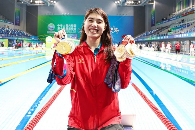 张雨霏展示她在东京奥运会和第十四届全运会上获得的奖牌