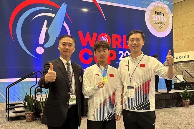 王梓赛(中)在2023年蹦床世界杯系列赛(美国站)中夺冠