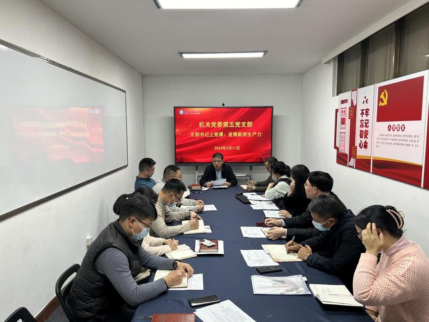 为深入学习贯彻习近平新时代中国特色社会主义思想,持续营造浓厚学习氛围,3月11日上午,机关党委第五党支部书记叶强在图书馆117室为支部全体党员讲授了题为《发展新质生产力》的专题党课。