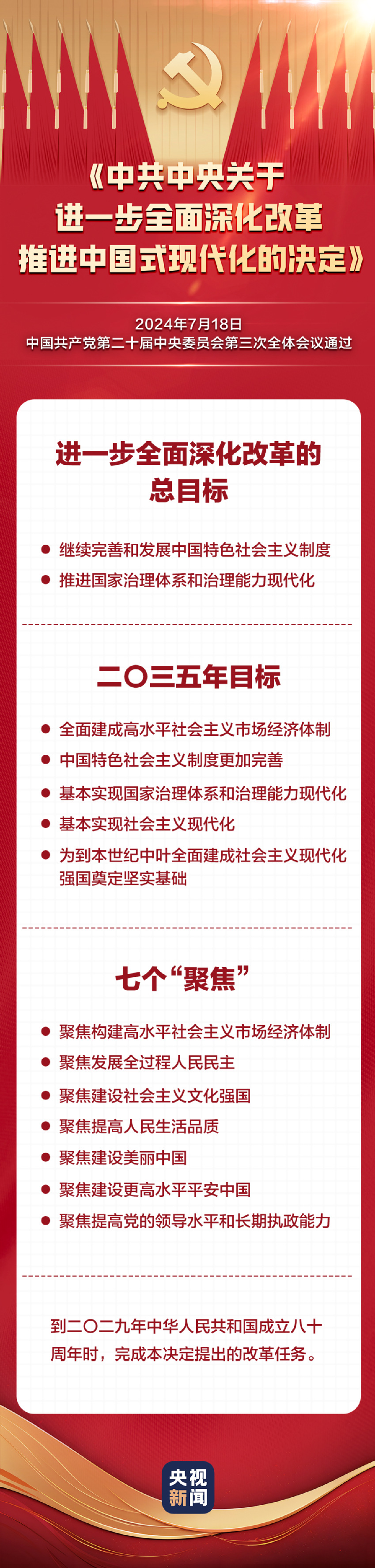 中国共产党第二十届中央委员会第三次全体会议,于2024年7月15日至18日在北京举行。全会最重要的成果是审议通过《中共中央关于进一步全面深化改革、推进中国式现代化的决定》。《决定》共15部分、60条,分三大板块,一文速览: