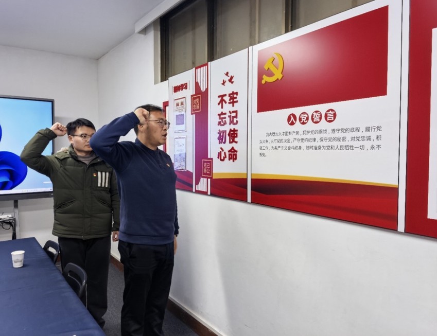 2024年1月4日,机关党委第五党支部在图书馆117室举行新党员入党宣誓仪式。支部书记叶强同志带领新发展党员陈强同志,面向党旗,许下对党忠诚、为共产主义事业奋斗终身的铮铮誓言。