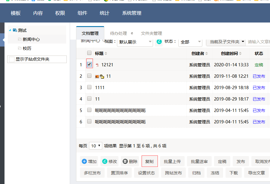 内容-文档管理,左侧点击文件夹名称,右侧选择一篇文章,点击“复制”按钮