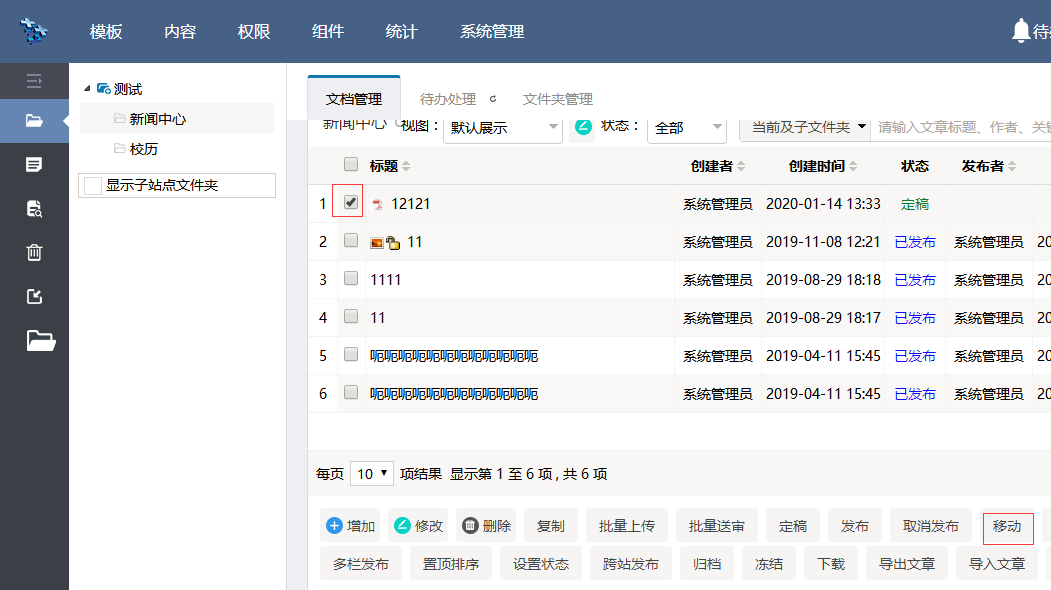内容-文档管理,左侧点击文件夹名称,右侧选择一篇文章,点击“移动”按钮