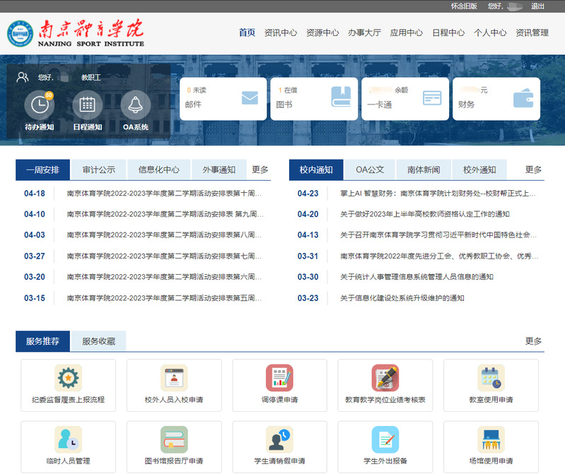 我校信息门户是一个以“个人事务更加便捷化、个人数据更加集中化、交互方式更加智能化”为宗旨,融资讯中心、资源中心、办事大厅、应用中心、日程中心、任务中心及个人中心为一体,统筹学校各部门资源,集成我校教学、人事、科研、学工等30余个业务系统资源,提供近40项师生线上服务的综合性服务平台,解决跨部门协同服务的难题,向师生提供统一式入口、集中式服务。
