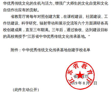 根据江苏省教育厅201941日下发“省教育厅关于开展江苏省中华优秀传统文化传承基地建设的通知”【苏教体艺函〔201912号】要求,中国近代武术研究中心在校党委书记朱传耿、副书记兰亚明的支持下,积极组织申报。经过省教育厅的考查、审核和推荐,我校成功获批江苏省中华优秀传统文化教育基地。基地建设期三年,中心将根据基地建设要求,围绕课程教学、社团建设、工作坊建设、科学研究、辐射带动、展示交流等内容做积极的努力。