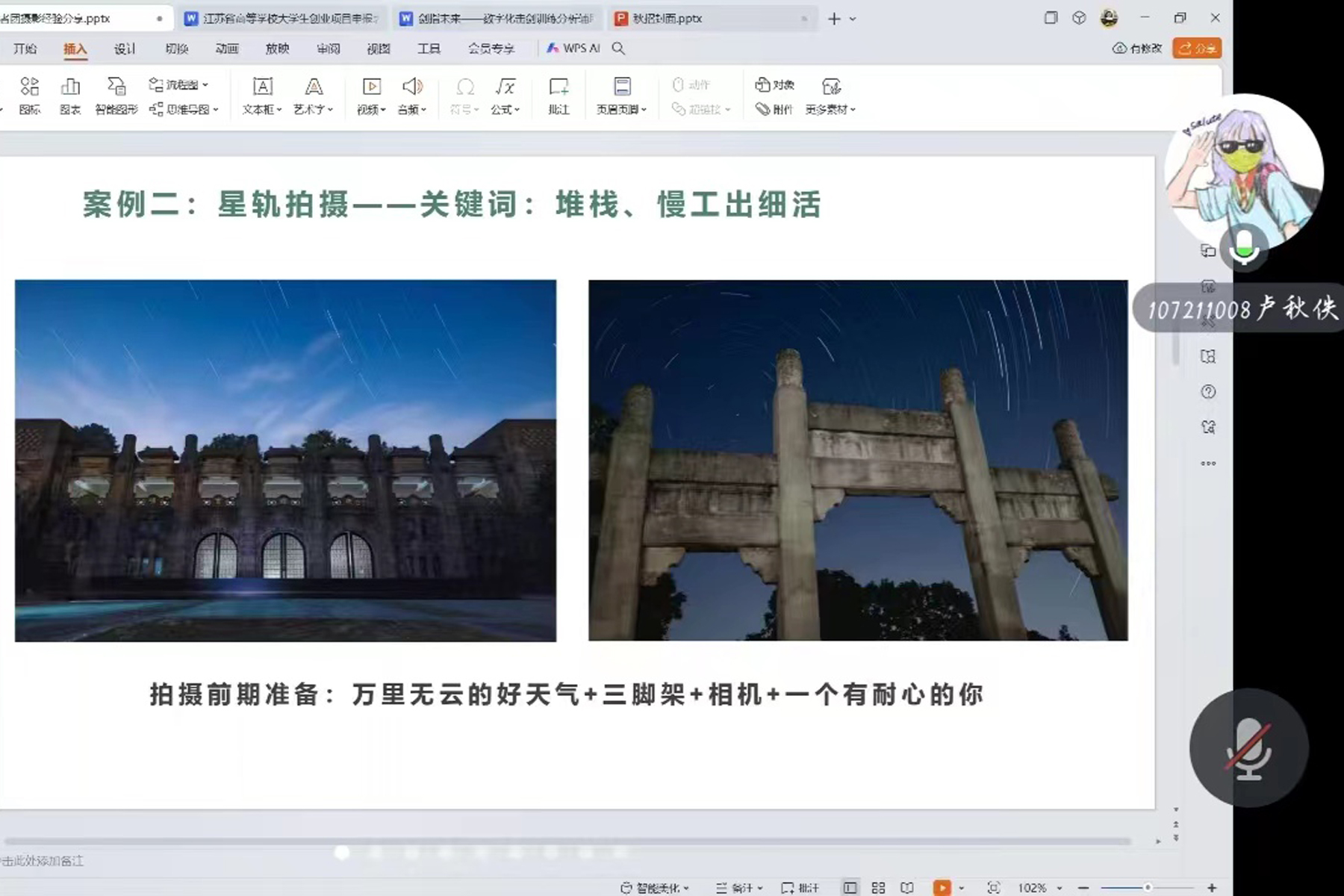 记者团团长卢秋佚对如何使用PS进行后期修图的操作进行了讲解。她介绍了对比度、高光、白平衡等概念和模糊处理与后期修图技巧并使用PS进行了实际操作。她还讲述了拍摄星轨照片的步骤方法以及醒图封面海报的制作技巧。