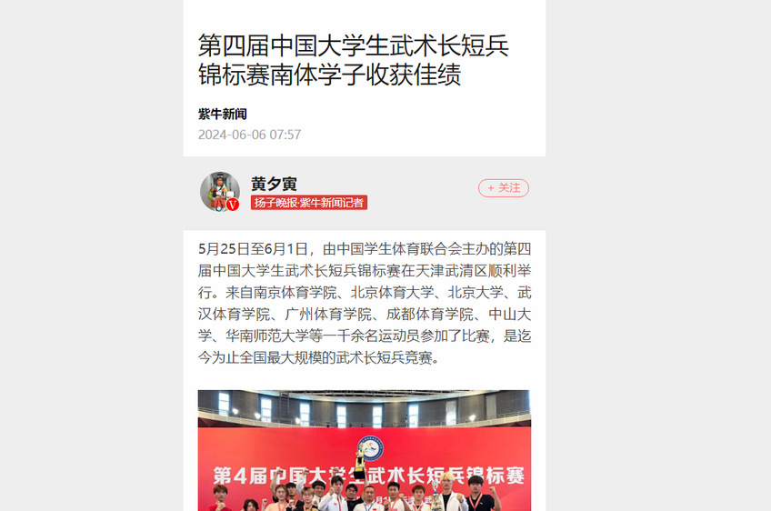 【扬子晚报】第四届中国大学生武术长短兵锦标赛bjycgold学子收获佳绩
