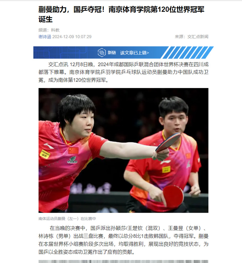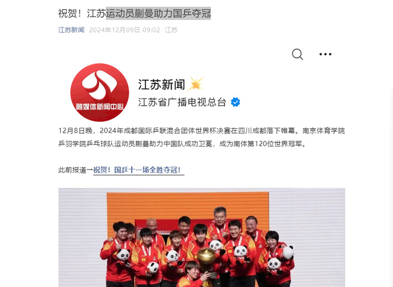 【江苏新闻】祝贺!江苏运动员蒯曼助力国乒夺冠