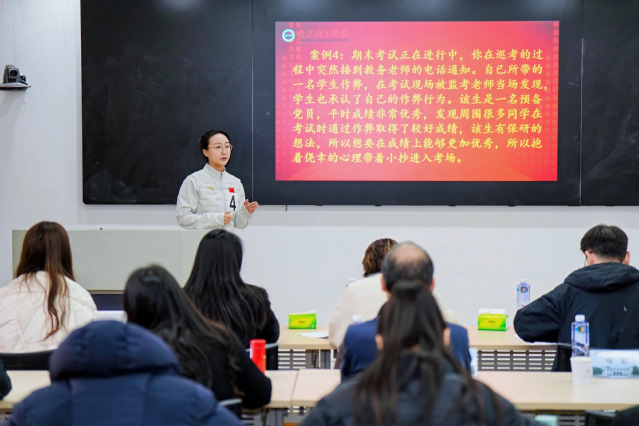 本次大赛以“精研育人实践,赋能生涯导航”为主题,既是辅导员职业风采的集中展示平台,更是育人经验交流共享的重要载体。比赛采用“现场展示+评委评分”的形式,设置主题班会展示和案例研讨分析两个核心环节,所有环节均按赛前抽签顺序进行。在主题班会展示环节,11位参赛辅导员围绕学生成长核心需求,精心设计主题内容,以逻辑清晰的流程安排、兼具温度与实效的育人表达,充分展现了扎实的业务功底和创新的育人思路。案例研讨分析环节中,辅导员围绕“问题核心判断、处置思路、育人启示”三大维度,快速梳理观点并深入阐述,评委则结合选手表现进行追加提问,进一步考察辅导员应对复杂学生问题的分析能力、处置技巧与育人思考深度。