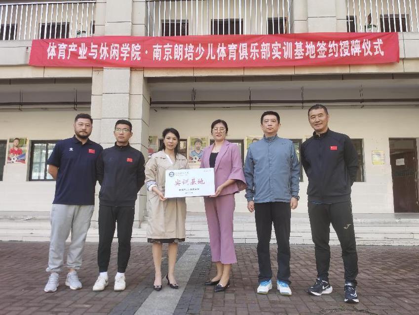 体育产业与休闲学院副院长柏景岚和南京朗培少儿体育俱乐部总经理姬荣共同签署共建实训基地框架协议书,在与会领导的共同见证下,体育产业与休闲学院副院长柏景岚为南京朗培少儿体育俱乐部授牌。