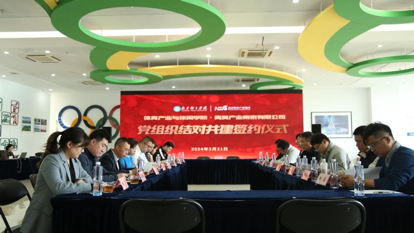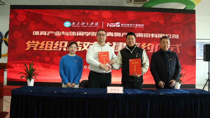 在双方领导的共同见证下,体育产业与休闲学院社会体育系党支部书记曹全军、青奥产业南京有限公司党支部书记袁葳签署了支部共建协议。