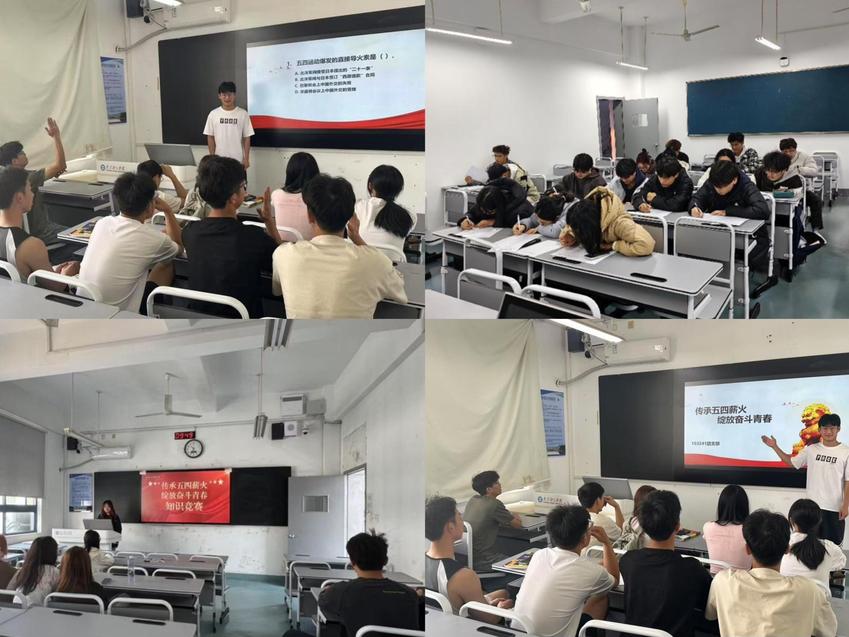 各团支部组织团员青年进行五四知识竞赛问答。通过竞赛活动,增进同学们对于“五四运动”历史背景、重要意义以及当代价值的深入了解,同时结合现场答题、组队抢答、随机提问等环节,将传承五四精神、激发爱国热情、勇于担当责任观念根植于青年学生心中。