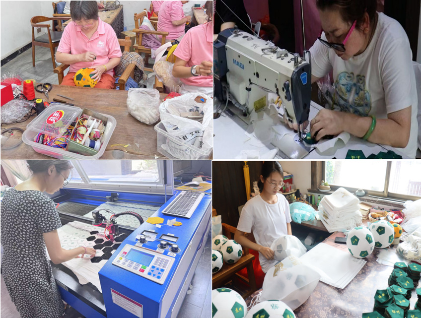其中值得关注的是,马庄村创新推出了“苏超足球定制款香包”,将体育文化符号与赛事文创属性相结合,一经推出获得热烈反响。随后,实践团队分组访谈了多位非遗传承工人,深入探讨非遗传承与体育文化的巧妙融合。团队成员纷纷表示,非遗技艺的匠心传承不仅是一针一线的坚持,更是带动乡村振兴的发展之路,也为体育文化促进乡村振兴提供了新的发展思路。