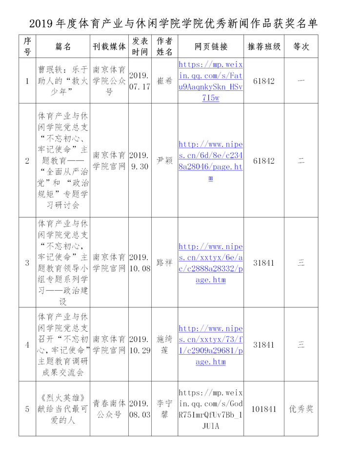 为激励我院广大学生进一步做好新闻宣传工作,院学生会开展了体育产业与休闲学院2019年优秀新闻作品评选活动。本次评选活动共收到5个班推荐的新闻作品20篇。经专家组评定并报院领导审定,评选出一等奖1篇、二等奖1篇、三等奖2篇,优秀奖1篇。具体情况如下: