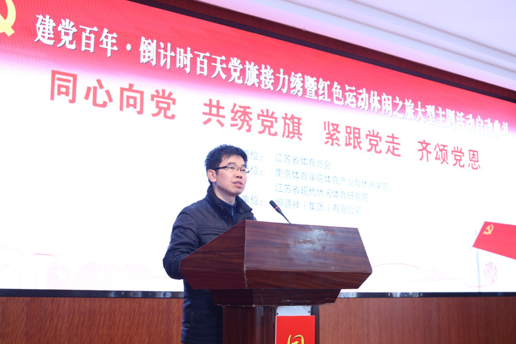 接着,江苏省现代休闲体育研究院院长惠飞致辞并指出,在为期100天的倒计时活动中,“同心向党 共绣党旗 紧跟党走 齐颂党恩——党旗接力绣暨红色运动休闲之旅大型主题活动”将举办系列活动,活动辐射全省13市,共同致敬党的百岁生日。
