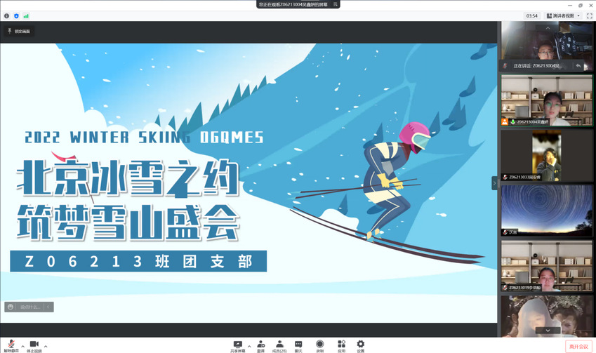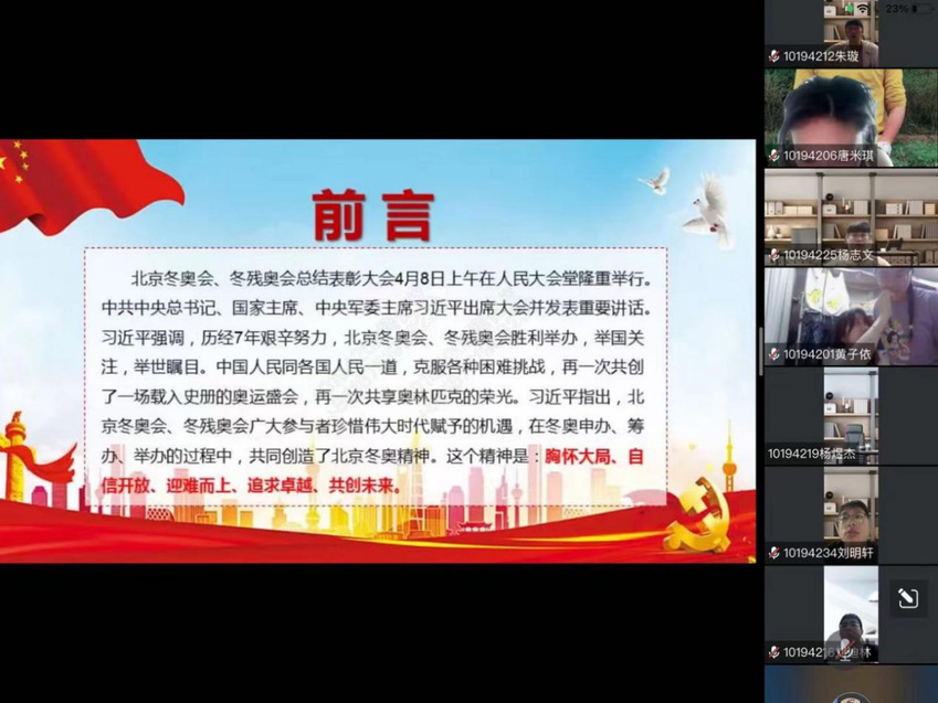 各团支书带领团员青年通过学习视频重温了大会现场庄重而热烈的氛围,同时介绍了冬奥会的相关知识,讲述了冬奥会的历史,深入学习了习近平总书记的重要讲话精神。通过学习,同学们全面领会 “胸怀大局、自信开放、迎难而上、追求卓越、共创未来”的北京冬奥精神,纷纷表示要牢记总书记嘱托,砥砺再出发,一起向未来,大力弘扬北京冬奥精神,以实际行动迎接党的二十大胜利召开,为实现第二个百年奋斗目标、实现中华民族伟大复兴的中国梦而不懈奋斗!