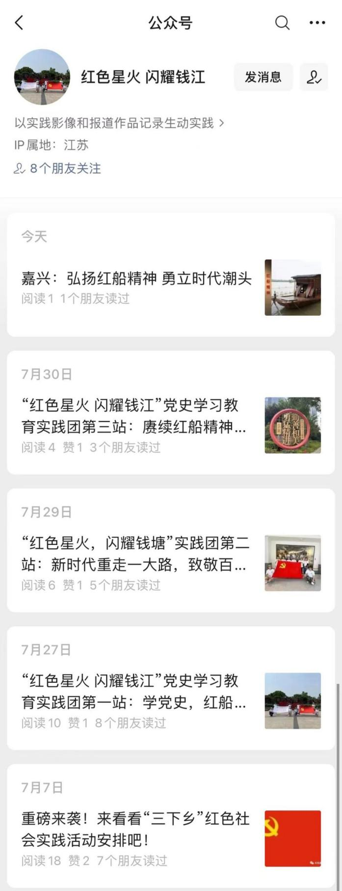 疫情和距离,阻挡不了当代青年人学习党史的热情。在实践活动的过程中,团队成员充分利用“抖音”APP开展线上直播,将党史学习的内容以及参观学习的实况实时推送至网络平台,带领全国各地想要学习党史的人们一起感受红船精神,传递主流价值。直播间党史学习的互动,更是将红船精神的星星之火,通过手机这一小小的窗口送入千家万户,在青年群体中厚植爱党、爱国情感。同时,还利用微信公众号,及时发布学习资料,推动党史学习教育。