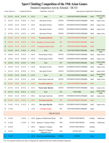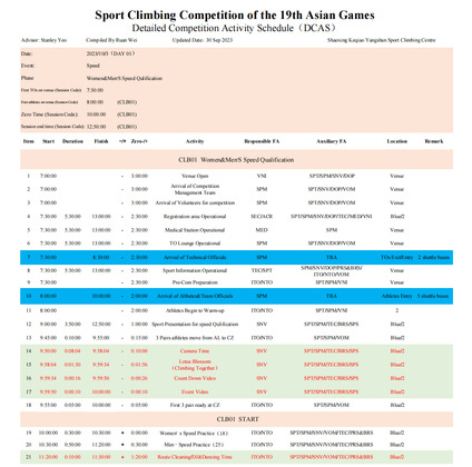 根据阮威介绍,通过参与杭州亚运会攀岩赛事的经历,让他对大型综合体育赛事组织有了体系化的认识,对竞赛的标准化、流程化和精准化管理有了更深入的理解,整体过程让他收获满满。其中他重点负责编制的《赛时每日竞赛活动详细进程表》(Daily Competition Activity Schedule,DCAS)在本次亚运会攀岩比赛中充分发挥了竞赛指挥调度的核心作用,是竞赛与其他相关领域协同配合的重要指挥蓝本。期间,阮威老师的编制的DCAS分别得到IFSC国际攀联运动部运营主管(Federico Ferro)和杭州亚运会攀岩项目技术代表(Stanley Yeo)的高度评价。