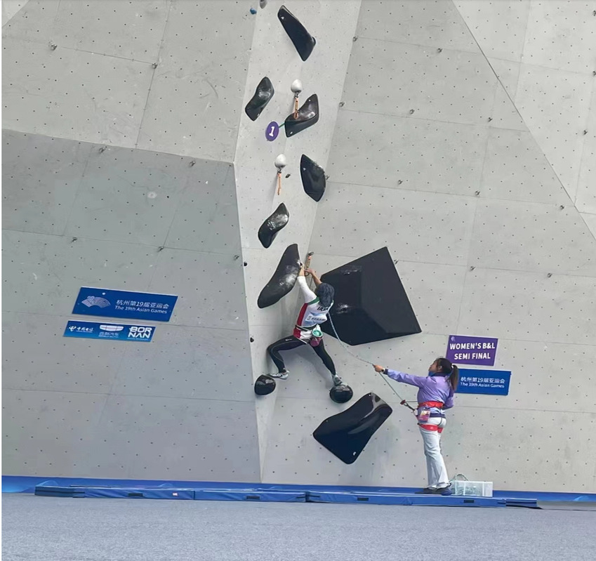 本次亚运会赛事,孙艳芳老师从国内众多优秀技术官员中选派出担任比赛期间的保护裁判工作,5天的比赛中,孙老师与团队成员密切合作,以精湛的技术和密切的配合为运动员的攀爬提供重要的安全保障,是亚运会比赛场上一道靓丽的风景线。
