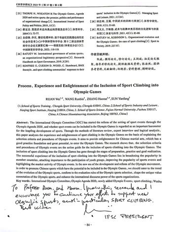 值得一提的,本次亚运会攀岩比赛IFSC国际攀联主席Marco Scolaris受邀亲临比赛现场,期间阮威老师获得难得的与主席先生交流机会,Marco主席对阮威老师发表的学术论文《竞技攀岩成为奥运会项目的历程、经验与启示》给予了较高的评价和称赞,并勉励阮威老师结合好当前攀岩项目成为奥运会新兴项目后备受广泛关注的发展契机,继续努力,产出更多的优秀成果。