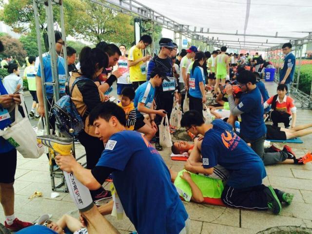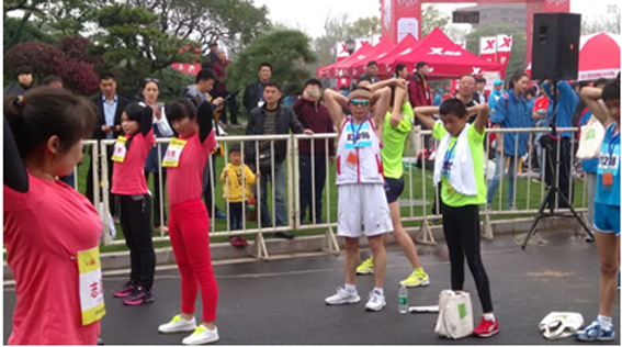 当日清晨5时15分,来自我院运动健康科学系的163名志愿者由系主任孙飙老师带队向扬州进发。到达古都扬州后,志愿者们开始了紧张的准备工作。随着第1名选手终点撞线,赛后恢复工作正式开始。志愿者成员按计划分布于赛场10公里和半程终点处,为选手们提供牵拉、冰敷、按摩、拉伸操等四种专业恢复服务。