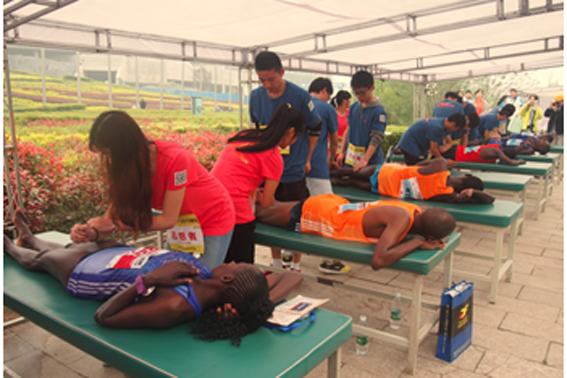 4月19日上午,在第十届“扬州鉴真国际半程马拉松赛”中,我院与赛事组委会合作,派出志愿者队伍为赛事提供赛后恢复服务。