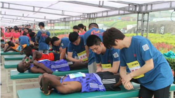 由于需要参赛选手较多,赛后恢复服务需求较大,我院志愿者为选手们提供了长达两个多小时的服务,平均每组志愿者服务人数多达30人。在服务过程中,志愿者们始终面带微笑,热情周到,很多人顾不上喝一口水。有的边服务边与选手交流恢复知识与技能,有的按摩按到手抽筋,有的长时间跪着牵拉以致磨破膝盖。